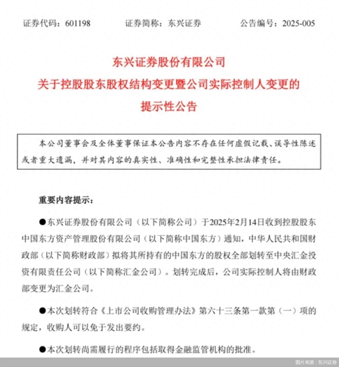 北京商报讯(记者 郝彦)2月14日,东兴证券发布公告表示,公司控股股东中国东方资产管理股份有限公司(以下简称“中国东方”)的股权结构将发生变更,财政部拟将其持有的中国东方的股权全部划转至中央汇金投资有限责任公司。划转完成后,公司实际控制人将由财政部变更为中央汇金投资有限责任公司。